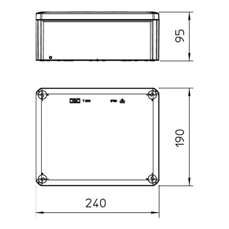 Abzweigdose für den Anschluss von Kabeln und Leitungen in Innenräumen und geschützten Außenbereichen. Rechteckige Form ohne Eingänge. Geeignet für Wand- und Deckenmontage, Montage auf Montageplatten und Einfädeln in den Boden. Mit der Möglichkeit der Innenbefestigung und der Montage an Eckprofilen. Deckel mit Schnellverschluss, verschließbar. Hergestellt aus halogenfreien Materialien. Abzweigdose nach DIN EN 60670. Schwer entflammbar nach DIN EN 60695-2-11, Prüftemperatur 650 °C. Schlagfestigkeit IK05 nach DIN EN 50102.
