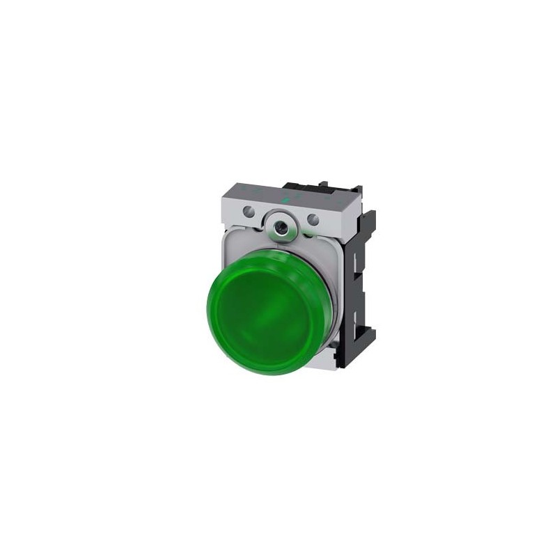Anzeige Siemens hell, 22mm, rund, metall, glänzend, grün, linse, glatt, mit halter, LED-modul mit integrierter LED AC 230 V, schraubklemme 3SU11566AA401AA0