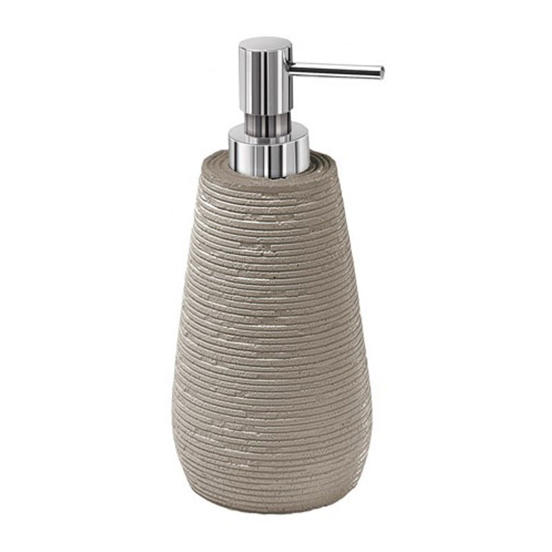 - 1 stehender Seifenspender graubeige mit Kunststoffspender, aus Kunstharz mit Steineffekt. Abmessungen 8,6x9,4x20,7cm.