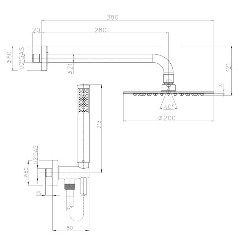 Das Dusch-Set ist komplett mit Schlauch, Handbrause und Kopfbrause.
