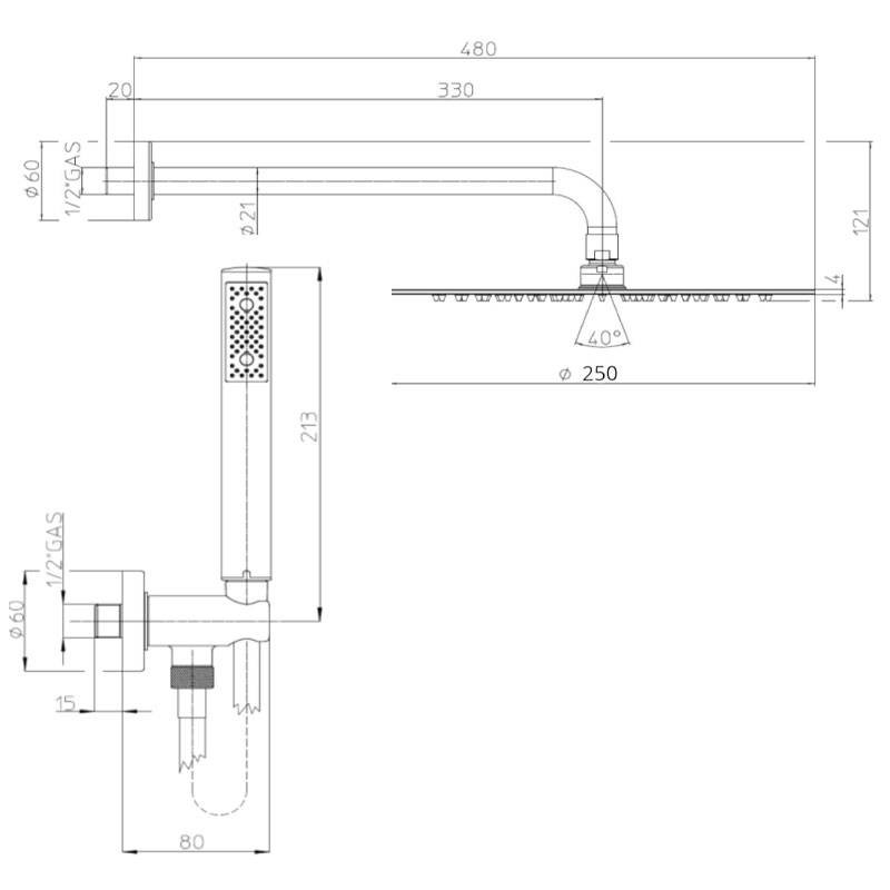 Das Dusch-Set ist komplett mit Schlauch, Handbrause und Kopfbrause.