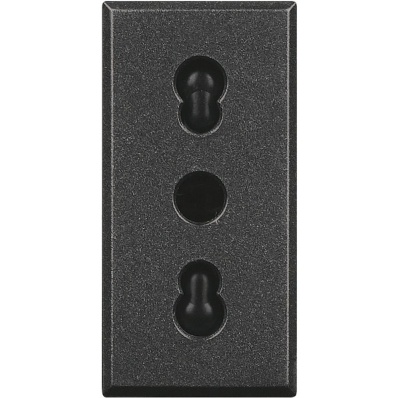 Bticino Axolute Zweiwege-Steckdose Anthrazitgrau. Die Zwei-Wege-Steckdose ermöglicht es Ihnen, sowohl die 10A-Stecker (kleine Stecker) als auch die 16A-Stecker (große Stecker) in sie einzuführen.