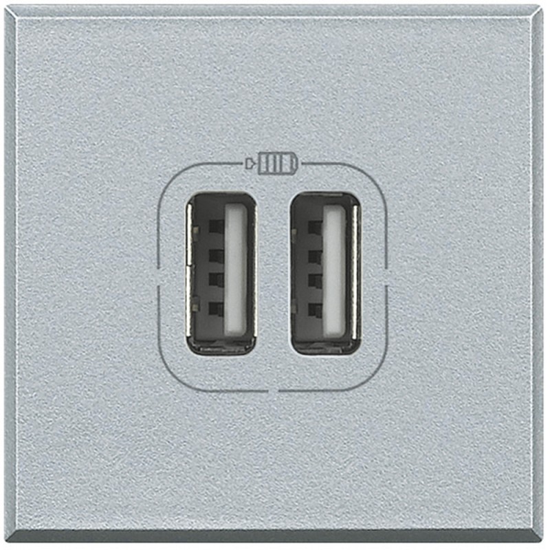 Bticino Axolute Grey Tech Doppel-USB-Ladegerät. Das Ladegerät wird mit Strom versorgt und dient zum Laden von Handys, Smartphones, Tablets und allen Geräten, die über USB geladen werden können.