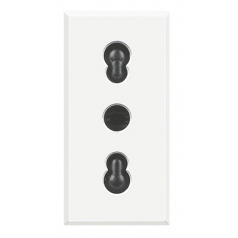 Bticino Axolute Zwei-Wege-Steckdose Weiß. In die zweipolige Steckdose können Sie sowohl 10A-Stecker (kleine Stecker) als auch 16A-Stecker (große Stecker) einstecken.