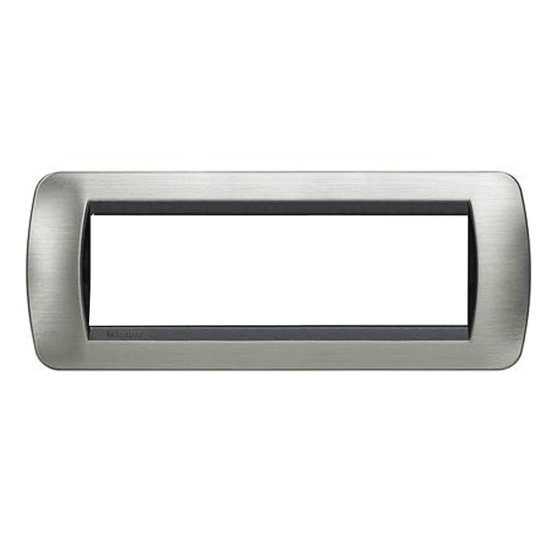 Abdeckrahmen Bticino LivingLight (ex international) 7 Module Farbe gebürstetem Stahl. Der Abdeckrahmen kann auf den Rahmen L4707 (altes Modell, das nicht mehr produziert wird) und LN4707 montiert werden.