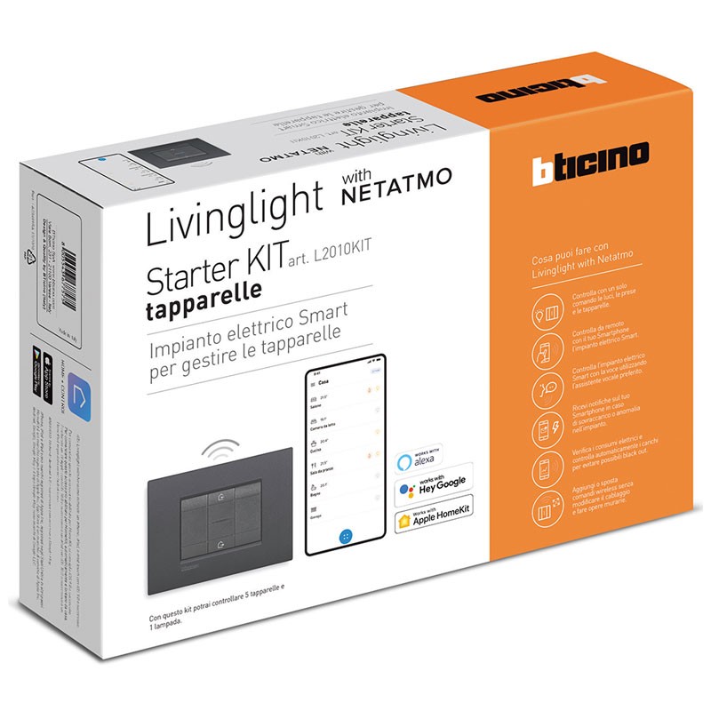 - Bticino Living Light Smart connected diverter anthrazitfarben, mit Netatmo, Ermöglicht die Steuerung der Beleuchtung vor Ort oder aus der Ferne. Wird wie eine herkömmliche Umlenkrolle installiert und ist mit allen Verbrauchern mit einer maximalen Leistung von 250 W kompatibel.