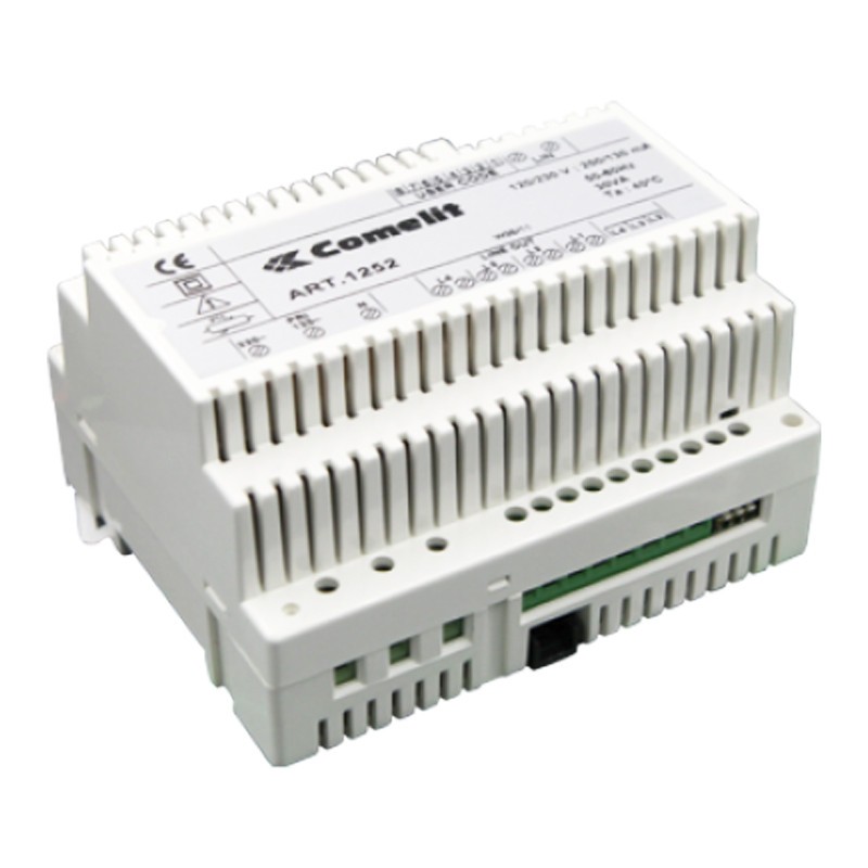 Comelit-Schnittstelle, über die bis zu 16 Audio- oder Videogeräte gleichzeitig abgespielt werden können. Die Schnittstelle versorgt die an das System angeschlossenen Videogeräte nicht mit Strom.