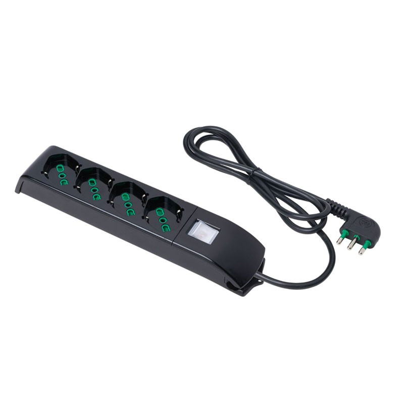 - Mit 4 italienischen/deutschen 2P+E 16 Ampere Steckdosen