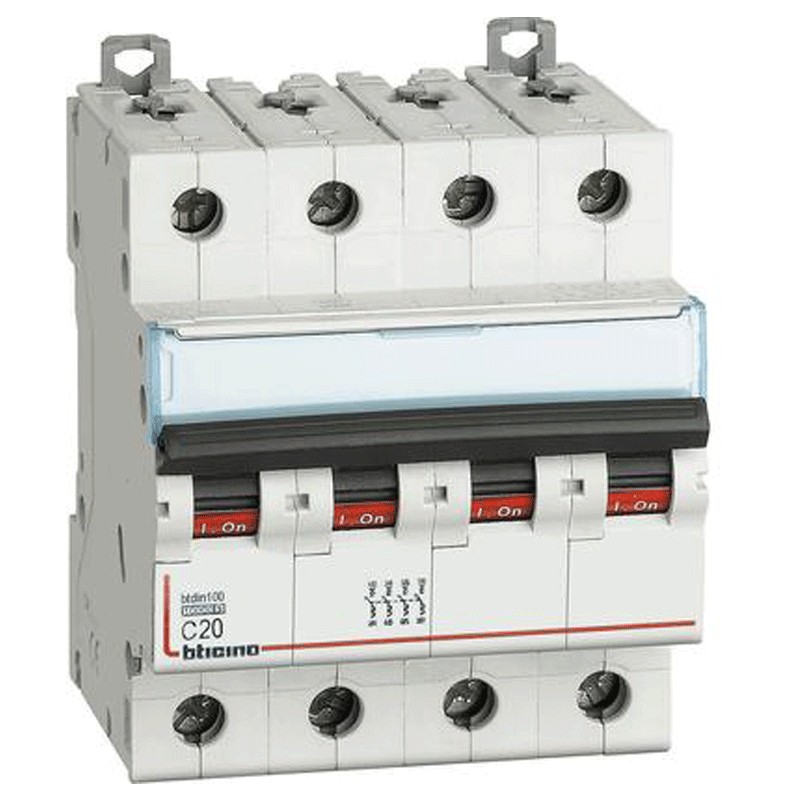 Leitungsschutzschalter Bticino, 4 Module, DIN-Anschluss (universell für jede Schalttafel auf dem Markt), Pole 4P, 20 Ampere, Ausschaltvermögen 10kA, Spannung 400 Vac, Kurve C.