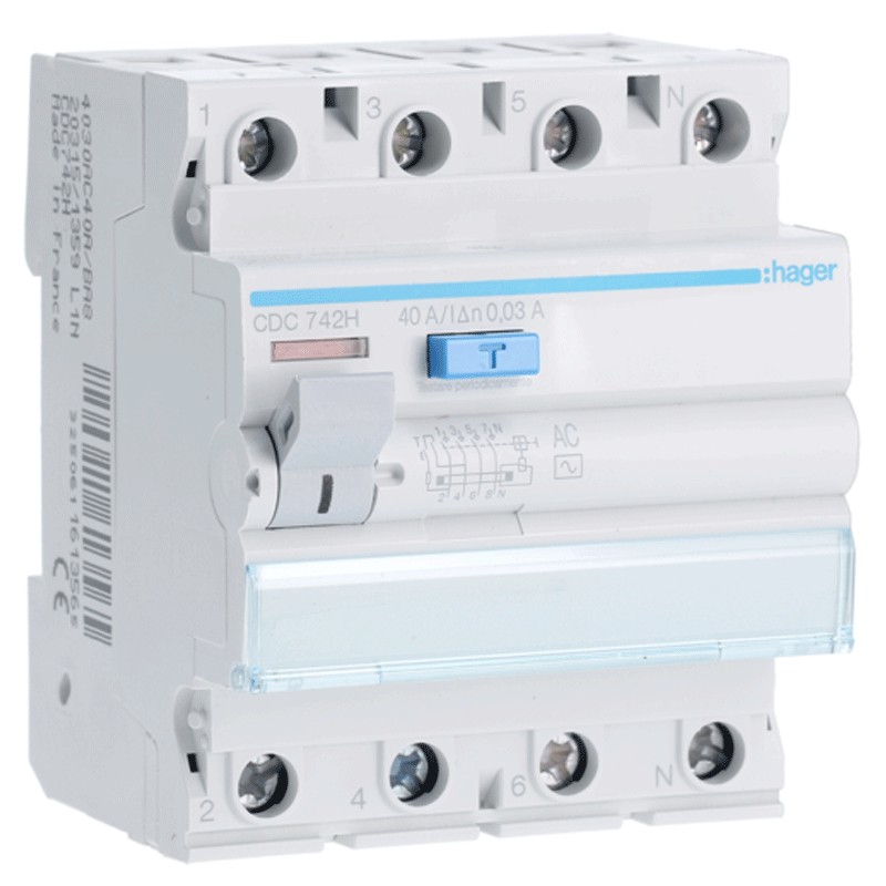 Fehlerstrom-Schutzschalter Hager, 4 Module, DIN-Anschluss (universell für jede Schalttafel auf dem Markt), 4P-Pole, Neutralstellung rechts, 40 Ampere, Differenzialstrom Idn 30mA, Spannung 230/400 Vac, AC-Differenzialtyp.