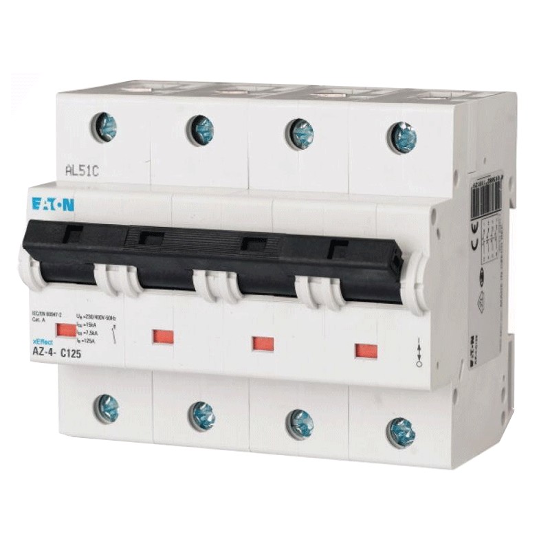 Thermisch-magnetischer Schutzschalter Eaton, 6 Module, DIN-Anschluss (universell für jede Schalttafel auf dem Markt), Pole 4P, 125 Ampere, Schaltvermögen 20kA, Spannung 230/400 Vac, Kurve C.