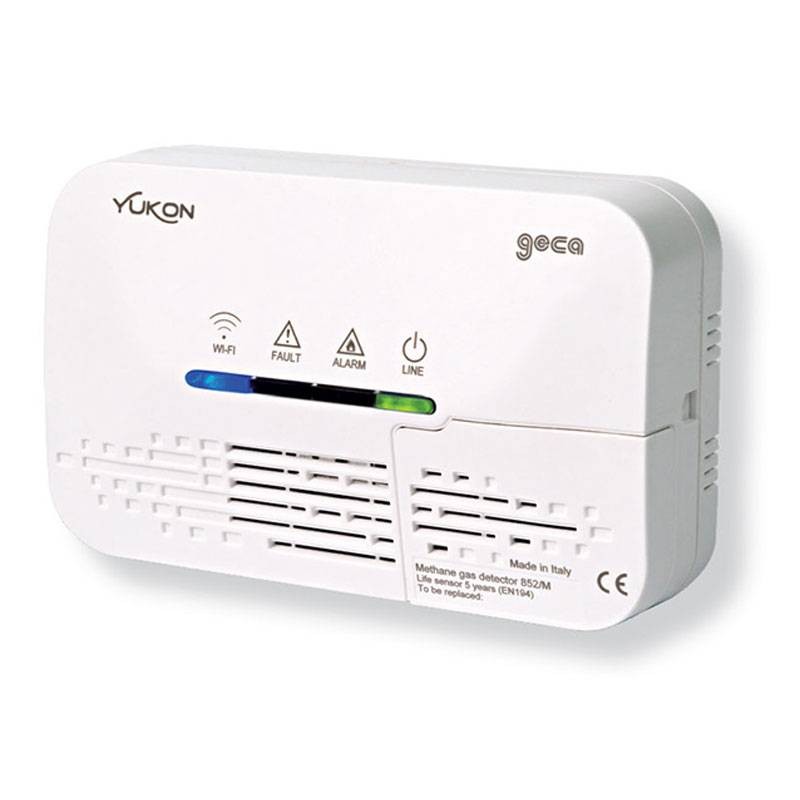 Der Erdgasdetektor Geca Yukon 852 ist ein an der Wand montiertes Steuergerät, das ein mögliches Methangasleck in der Wohnung erkennt und davor warnt.