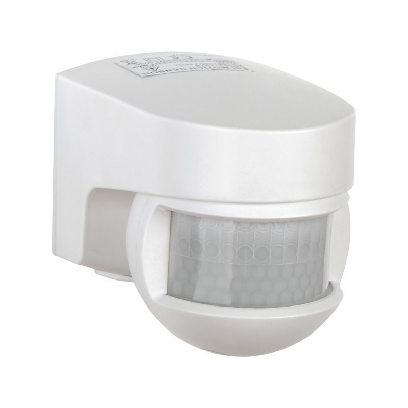 Vemer Sensor 140 Wand-Bewegungsmelder mit Infrarot-Technologie. Der Sensorkopf kann gedreht und geneigt werden, um den gewünschten Erfassungsbereich abzudecken. Empfindlichkeit und Eingriffsverzögerung können über Trimmer eingestellt werden.