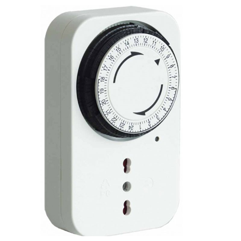 Vemer TWIN PLUG DAY elektromechanische Zeitschaltuhr mit Drehschalter und Tagesprogrammierung. Die zweiseitige Steckdose ermöglicht den Anschluss von 10A oder 16A Lasten.