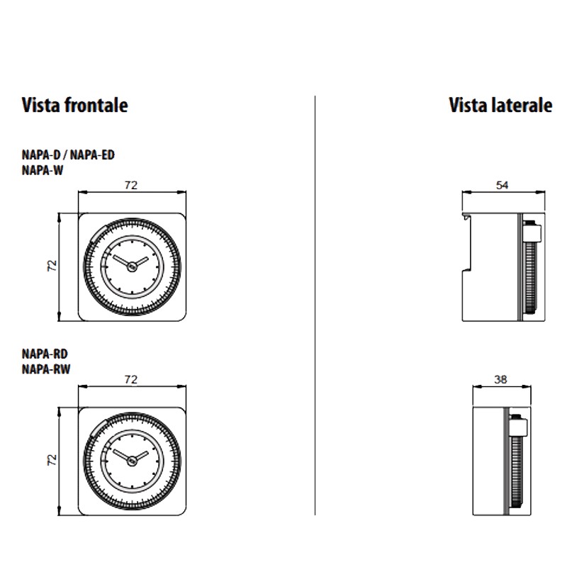 Elektromechanische Zeitschaltuhr mit Wochenprogrammierung, mit Gangreserve. Die Installation kann als Schalttafel-, Wand- oder DIN-Schienenmontage erfolgen.