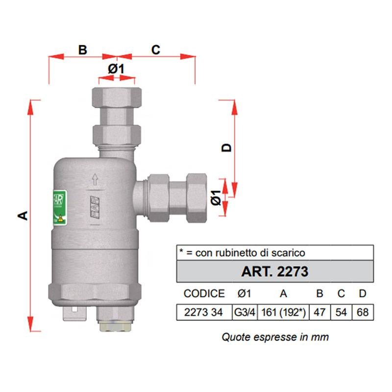 - Ultrakompakter Schmutzabscheider für thermische Anlagen, komplett mit Magnet zur Beseitigung von Eisenpartikeln, Gehäuse CB753S aus Messing, verchromt, Anschlüsse an Rohrleitungen F-F, Ablasshahn zur Schlammabfuhr, Nenndruck 10 bar, maximale Betriebstemperatur 110°C, Anschlüsse Größe 3/4 F-F, abnehmbare Patrone und abnehmbarer Magnet.