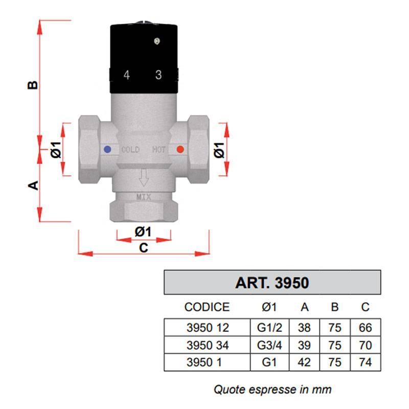- Mischventil für Sanitärinstallationen, aus verchromtem Messing, mit 1/2- 3/4- 1 Innengewinde, Drehknopf aus ABS, mit nummeriertem Wahlschalter von 1 bis 5, der einem Einstellbereich von 30÷65°C entspricht, und Temperatursperre, Verbrennungsschutz, thermosensitives Wachselement. Max. Eingangstemperatur 95°C. Max. Betriebsdruck 10 bar.