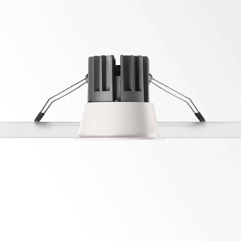 Einbaustrahler aus Aluminiumdruckguss mit runder oder quadratischer Hülse, geeignet für die Montage an Gipskartondecken. Mattschwarze Oberfläche RAL 9011.