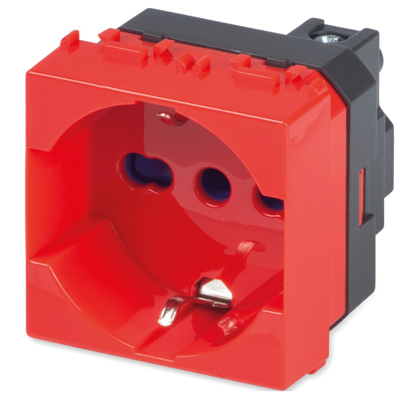 Schuko-Universal-Doppelsteckdose 2P + T 10/16A 250V Master Mix, 2 Module Farbe rot. Die Schuko-Steckdose (oder deutsche Steckdose), wird häufig für Verbraucher mit höherer Stromaufnahme wie Waschmaschine, Backofen, Staubsauger, Luftentfeuchter und Bügeleisen verwendet.