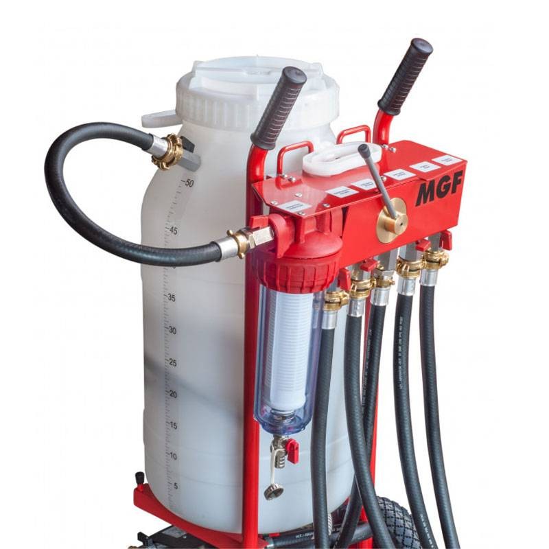 - Beladen von Kreisläufen mit gemischten Chemikalien oder Wasser dank des graduierten Behälters