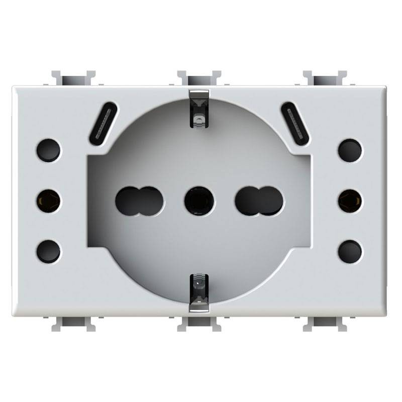 4Box P503 USB-Steckdose kompatibel mit dem Bticino Matix Schalterprogramm, Farbe weiß, mit 5 Steckdosen und einem einzigen Stromanschluss, bestehend aus 2 USB 3A Typ C Steckdosen, 1 Schuko, 2 10A Steckdosen und 1 10/16 A Steckdose.