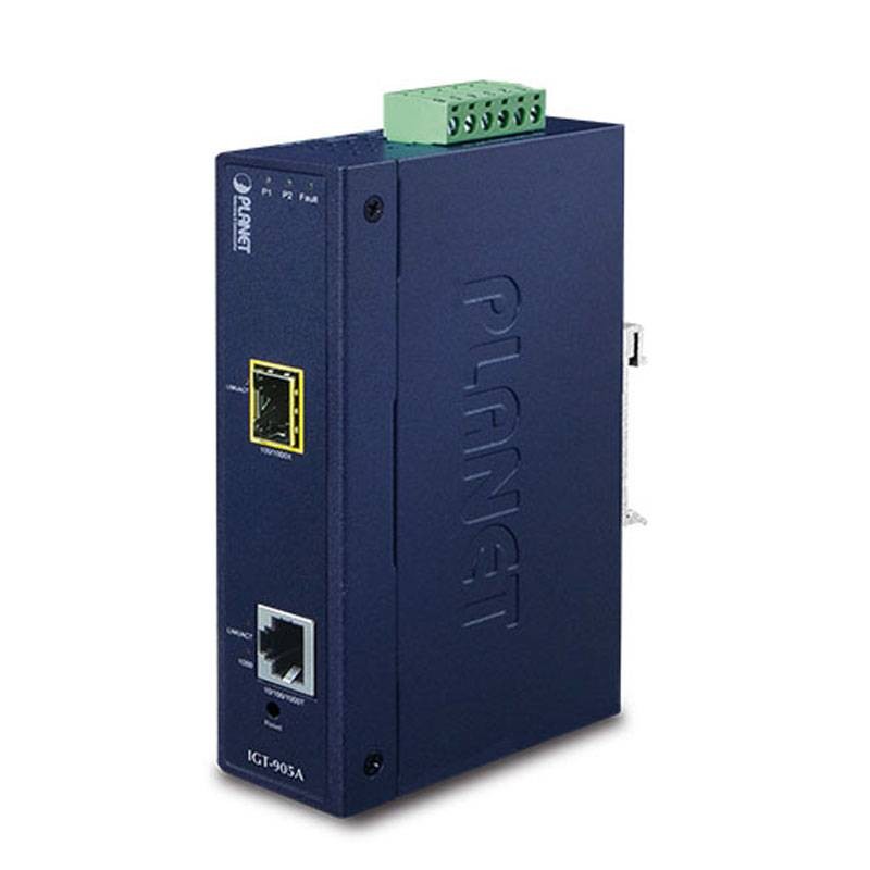 Der PLANET IGT-905A Industrial Managed Media Converter unterstützt effizient die Konvertierung zwischen 10/100/1000BASE-T und 100/1000BASE-X Ethernet und bietet Fernüberwachungs- und Managementfunktionen. Der IGT-905A bietet die Flexibilität des Betriebs mit allen Arten von 10/100/1000 Mbit/s-Ethernet-Medien am RJ45-Port und bietet eine äußerst stabile Gigabit-SFP-Glasfaserleistung. Außerdem bietet es dynamische Statusberichte und Echtzeit-Alarmmeldungen, die dem Netzwerkadministrator die Überwachung und Verwaltung des gesamten industriellen Netzwerks erleichtern.