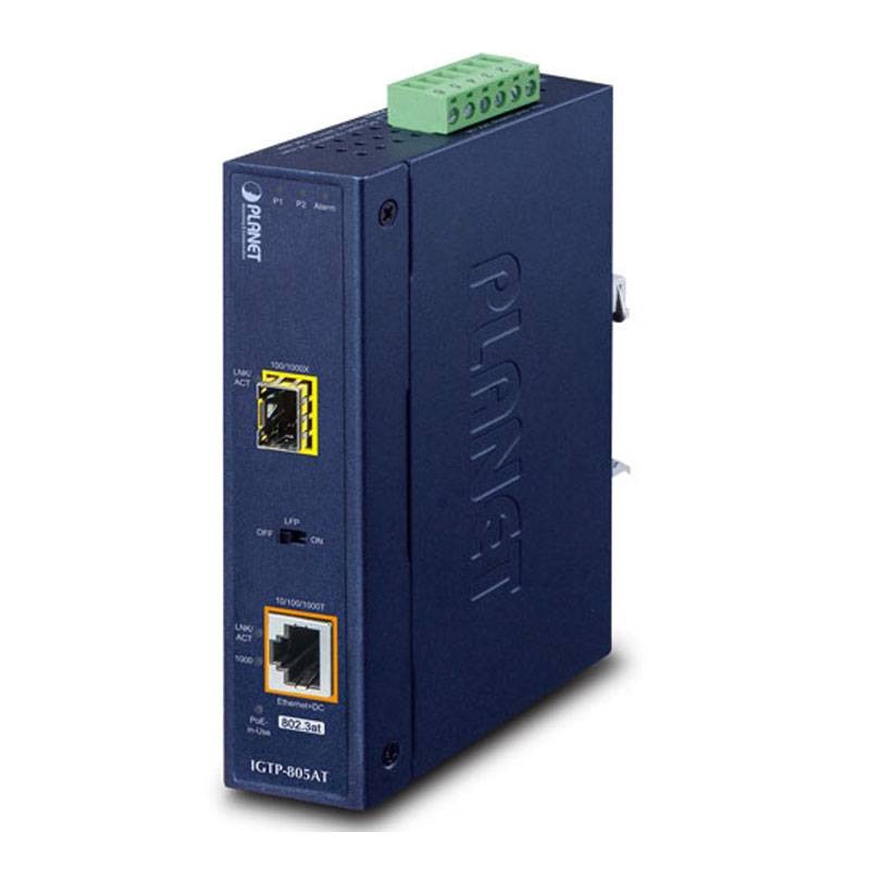 Der PLANET IGTP-80xT Industrial Gigabit Media Converter kombiniert eine Ethernet-Medienkonvertierung (1000BASE-X zu 10/100/1000BASE-T) mit einem 802.3at Power over Ethernet Plus (PoE+) Injektor, um bis zu 30 Watt Ausgangsleistung und hohe Datenraten für PDs (Powered Devices) zu liefern, die in einem abgelegenen Bereich installiert sind, wo eine ausreichende und zuverlässige Stromversorgung erforderlich ist. Sein 1000BASE-X-Glasfaser-Uplink-Port ermöglicht eine schnelle und stabile Datenübertragung über große Entfernungen zu einem entfernten Kernnetz. Das spezielle, kosteneffiziente Stromversorgungssystem des IGTP-80xT unterstützt einen 12~48 V DC Stromeingang oder einen 24 V AC Stromeingang für Stromredundanz und betriebliche Flexibilität.