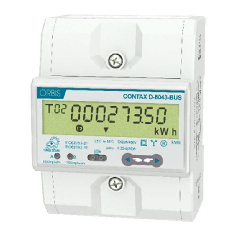 Dreiphasen-Wirkverbrauchszähler Orbis CONTAX D-8043, bidirektional ist ein dreiphasiger bidirektionaler Energiezähler mit direkter Einfügung auf vier Drähten, mit RS485-Kommunikation und Mod-Bus-Protokoll, für die DIN-Schienen-Installation. Er wurde entwickelt, um die Integration von Ladestationen des Modells VIARIS UNI / VIARIS COMBI+ in Systeme mit dreiphasiger Photovoltaik-Produktion mit folgenden Eigenschaften zu ermöglichen