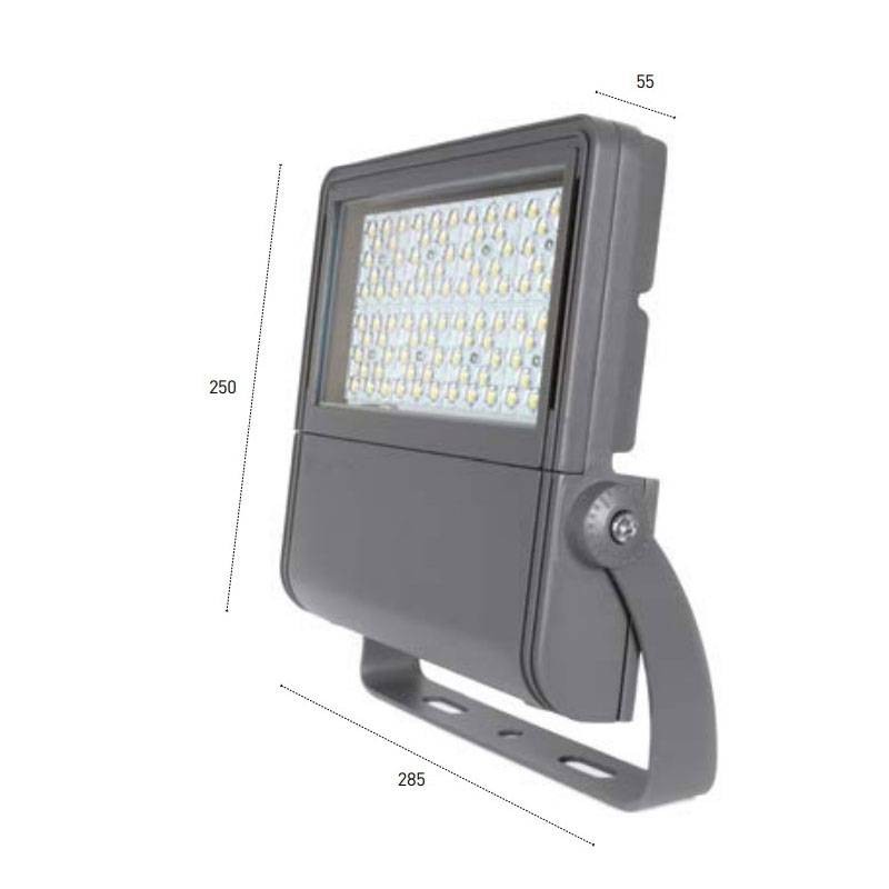Hocheffizienter Außenprojektor mit optischem Multi-Chip-System zur Verbesserung der Lichtverteilung und Gewährleistung hoher Zuverlässigkeit, Gehäuse mit verbessertem aerodynamischen Widerstand, passiviert und mit hochfester Epoxidfarbe lackiert, Hardware aus rostfreiem Stahl und goniometrisches System zur präzisen Einstellung des Lichtstrahls. Konform mit den Nocken der Straßenbeleuchtung.