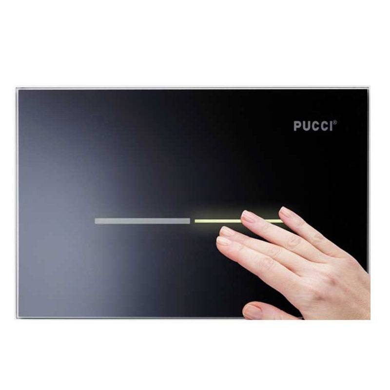 Die Pucci ECO Sfioro-Betätigungsplatte ist mit einer Sensorsteuerung ausgestattet: Berühren Sie einfach einen der beiden Sensoren mit einer einfachen Berührungsbewegung (wie mit einem Smartphone), und der Spülkasten setzt sich in Bewegung. Die Berührung des linken Sensors aktiviert die 9-Liter-Spülung (oder 6-Liter-Spülung), die Berührung des rechten Sensors aktiviert die 4-Liter-Spülung (oder 3-Liter-Spülung).