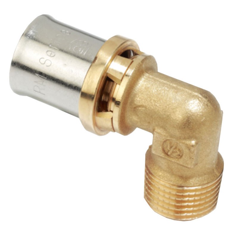 Giacomini 90° gebogene Pressfittings mit Außengewinde und mehreren Kavitäten. Abmessungen 1/2" x (16 x 2).