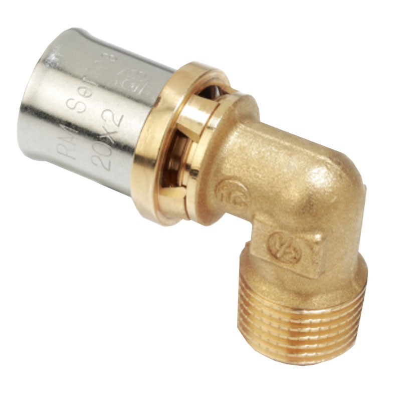 Giacomini 90° gebogene Pressfittings mit Außengewinde und mehreren Kavitäten. Abmessungen 1/2" x (20 x 2).