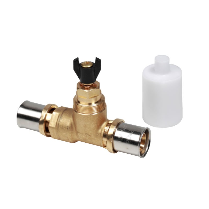 Giacomini-Schraubabsperrventil mit Mehrkavitäten-Pressanschlüssen. Abmessungen 20 x (20 x 2).