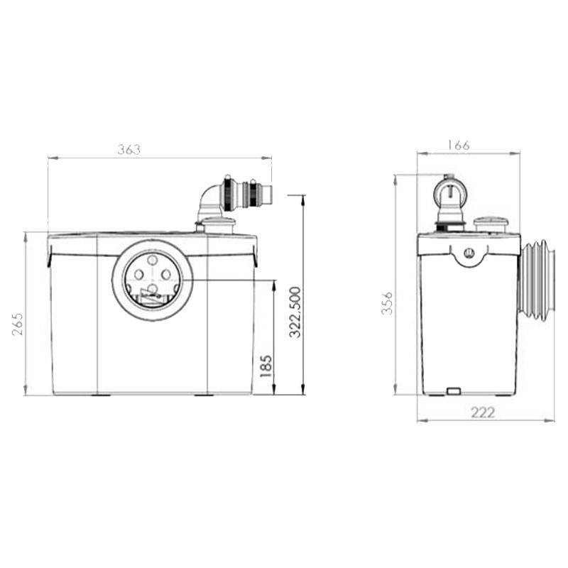 Die Sanitrit-Hebeanlage wird hinter einem WC (Standard) oder Waschbecken mit horizontalem Abfluss installiert und leitet das Abwasser über ein PVC-Rohr mit einem Durchmesser von 22, 28 oder 32 mm ab. Er ist mit einem Rückflussverhinderer ausgestattet, der ein unangemessenes Einschalten des Geräts verhindert und das Risiko eines Wasserrückflusses in die Toilette oder andere Sanitäreinrichtungen ausschließt.