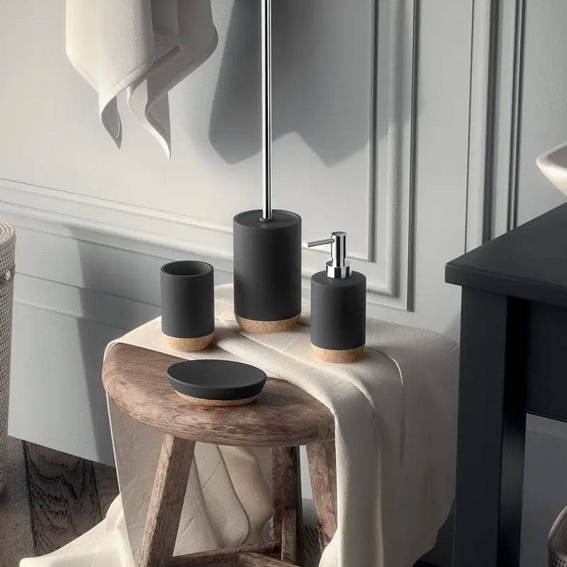 Die Serie Ilary umfasst auch einen Zahnputzbecher, einen Seifenspender mit verchromtem Kunststoffspender und eine Toilettenbürste.