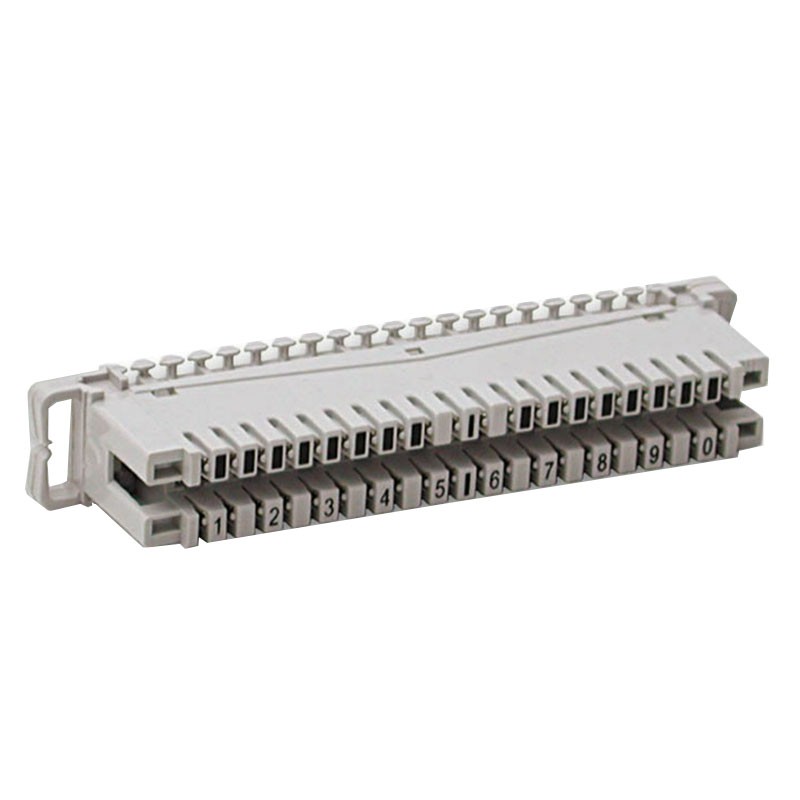 10-paariges Kat.3- oder LSA-Fanton-Telefonanschlussmodul für Telefon-Permutationen, Snap-in-Einschub auf Aluminiumhülse, Farbe elfenbein, mit seitlichen Permutationsführungsringen und Kabelbefestigungspads.