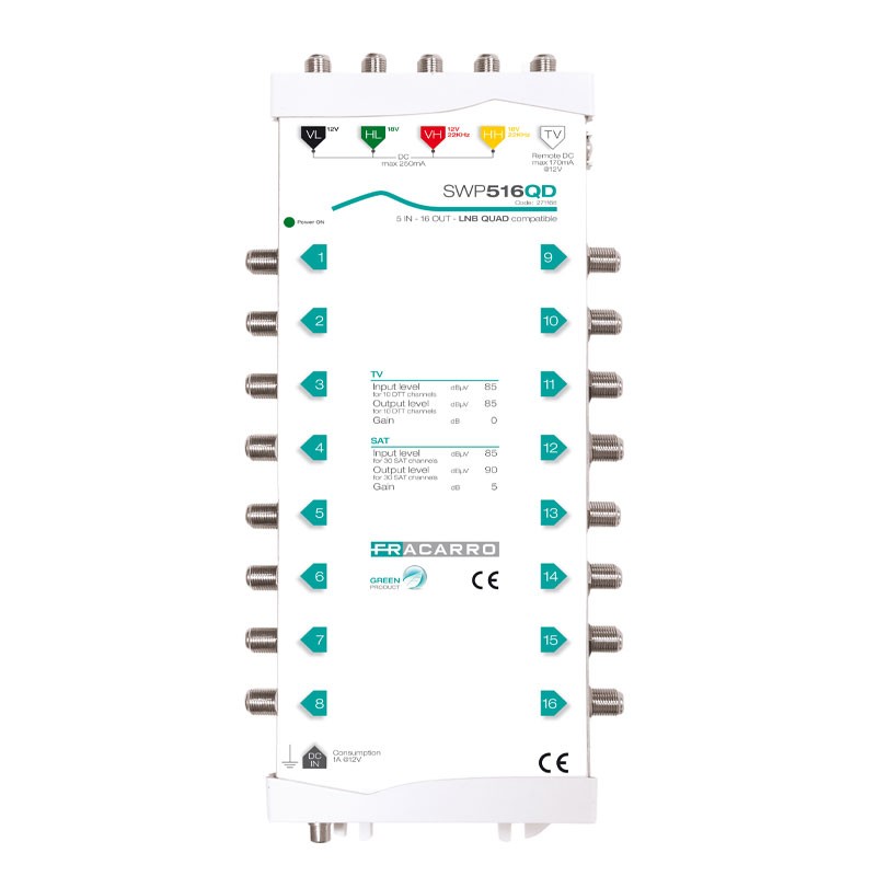Fracarro SWP516QD kompakter Multischalter, 5 Eingänge mit aktiver Verstärkung in den TV- und Satellitenbändern. Kompatibel mit QUAD und QUATTRO LNBs.