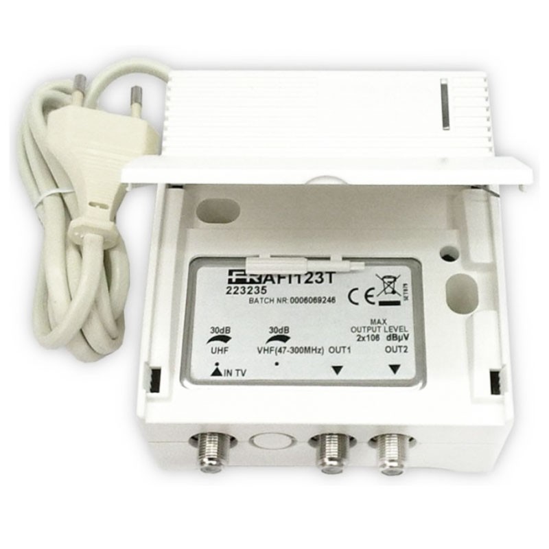 Fracarro-Verstärker mit 1 Eingang und 2 Ausgängen (VHF+UHF) für den Innenbereich, mit eigener Stromversorgung, mit den folgenden Eigenschaften: