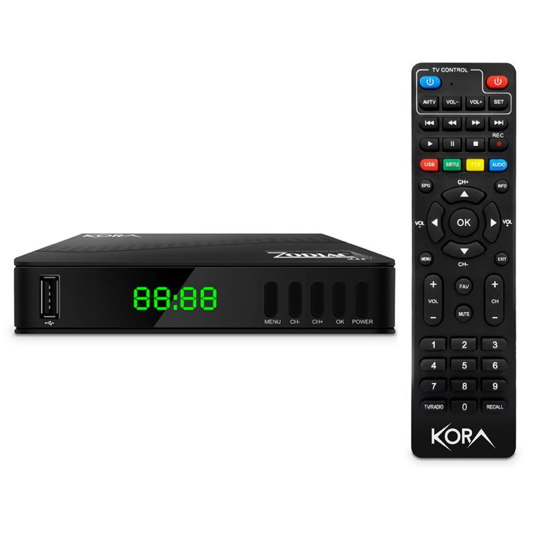Kora DZR-3341 ist ein digitaler terrestrischer Decoder der neuesten Generation. Er unterstützt die aktuellen 'DVBT'-Standardübertragungen und ist kompatibel mit den 'Switch Off 2021'-Spezifikationen gemäß dem neuen DVBT2/HEVC 60Hz- und 10-bit-Standard. Mit dem Kora DZR-3341 ist es möglich, alle digitalen terrestrischen Kanäle sowohl in Low als auch in High Definition zu empfangen. Das Kora DZR-3341 verfügt außerdem über eine Media-Player-Funktion, mit der Fotos und Filme direkt von einem USB-Speicher wiedergegeben werden können.