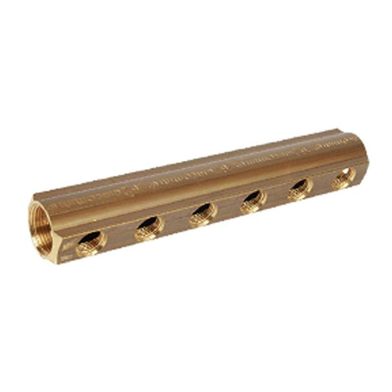 Giacomini-Verteiler aus Messing mit Haupt- und Abzweiganschlüssen mit Innengewinde und folgenden Merkmalen: