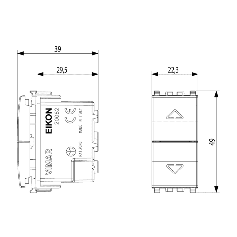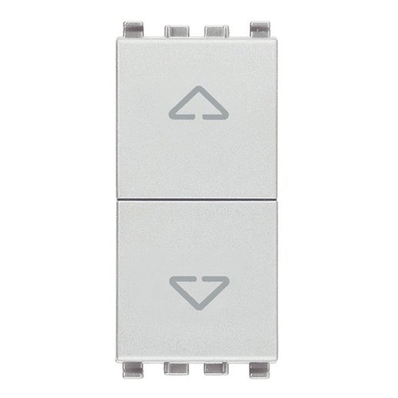Zwei verriegelte Drucktaster Vimar Eikon 1P NO + 1P NO 10 A 250 V, mit Richtungspfeilen, 1 Modul Farbe grau daneben.