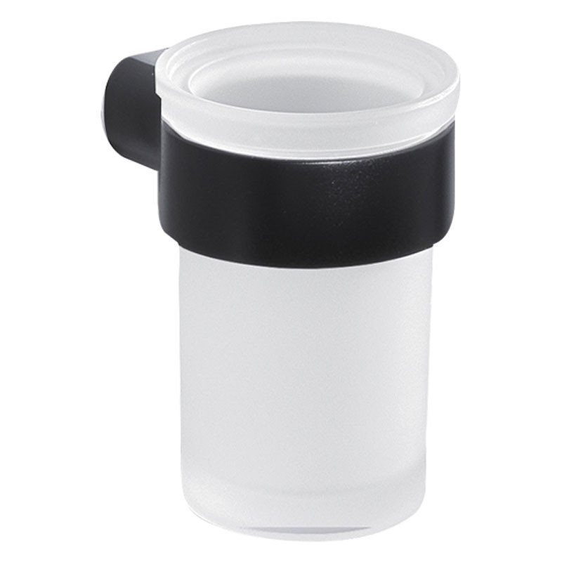 Gedy Pirenei Zahnputzbecher Wandmontage aus Edelstahl und Chromall, mit Milchglasbehälter, Farbe mattschwarz, Maße 6,9x9,2x10,4cm.