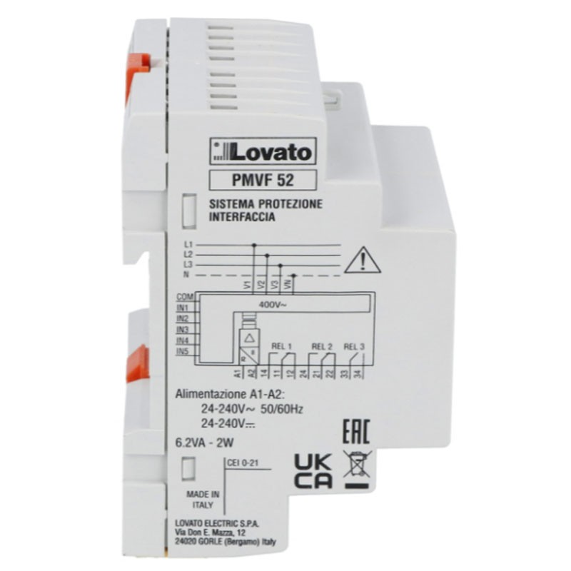 Lovato interface protection system for single-phase and three-phase system with and without low voltage neutral, with the following characteristics: