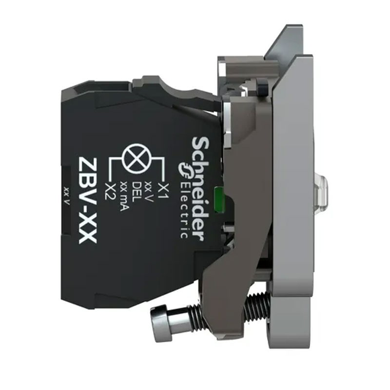 It is powered by 24 VAC/DC and uses screw terminals. It has a metal body and is compatible with Harmony XB4 indicator lamps. This light element allows for quick and easy replacement and configuration of warning units. It can be easily installed and replaced on compatible selector units or light buttons by snap-on mounting and connected with simple screw connections. Allows signaling units to be visually distinguished through integrated LED illumination. Protects operators from accidental contact with live circuits through its IP20 rating.