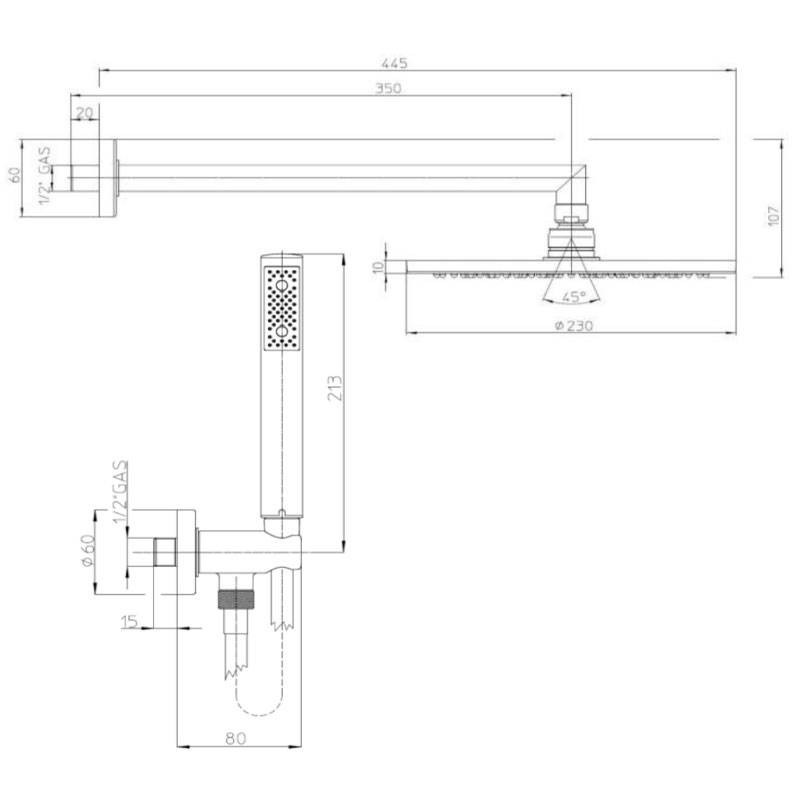 Included in the package: shower head, shower arm, hand shower and connecting hose.