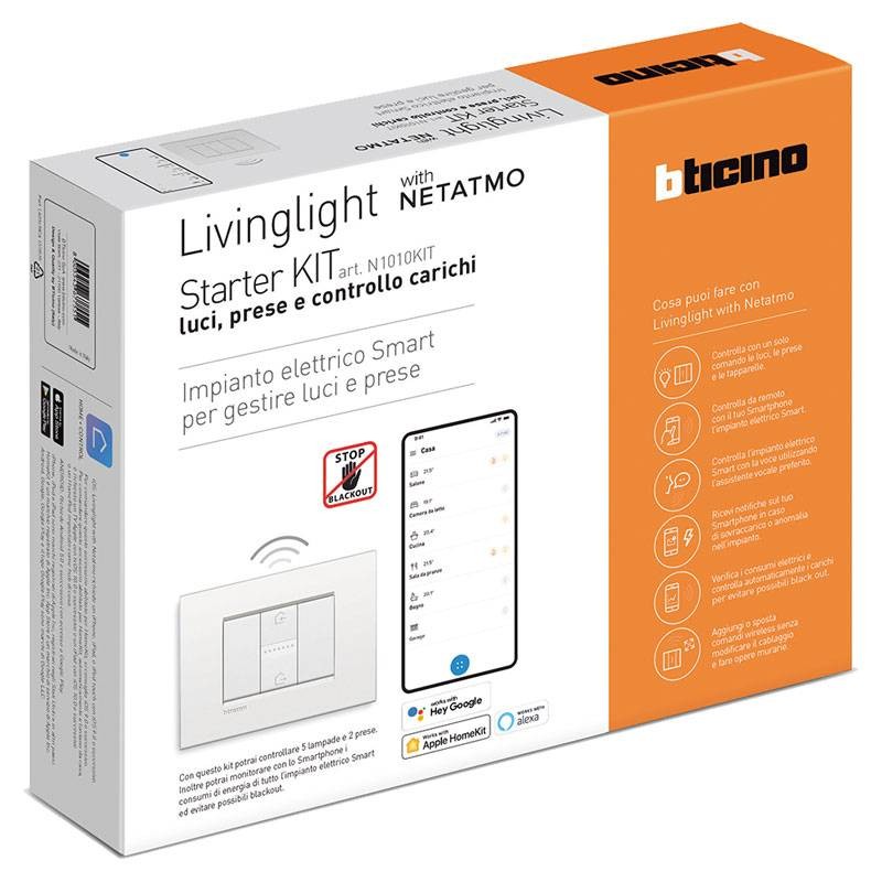 Bticino LivingLight White Starter Plus Kit to manage lights, outlets, monitor energy to avoid blackout when the maximum power under the user's contract is reached, and manage temperature.