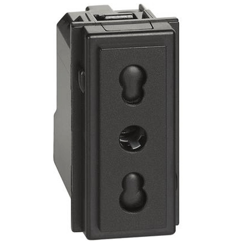 Bticino Living Now two-pins socket, Voltage: 250 Vac, 2P+E, current In 10/16A, black 1 module, centre distance 19 mm and 26 mm, for 2 P and 2 P+E 10 and 16 A plugs. The 2-pin electrical socket allows both 10A plugs (small plugs) and 16A plugs (large plugs) to be inserted inside.