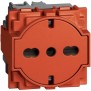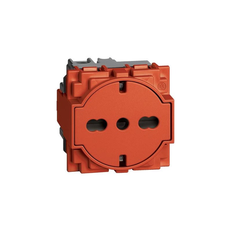 Outlet flat standard German and Italian. The surface of the socket, when the plug is inserted, it slides to the inside of the cockpit; returned to the initial position when the plug is pulled out. Socket 2 P+T 16 A 250 Va.c. - centre distance 19 mm and 26 mm in configuration bypass - the alveoli of the protected - side contacts of the ground for thorns, the German standard - suitable for: plugs standard Italy 2 P and 2 P+T 10/16 A, thorns German standard 2 P+T16 - no backlighting available - 2 modules-Red