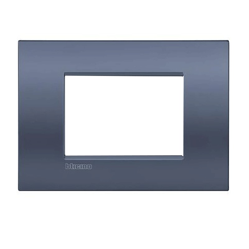 Plate Bticino LivingLight AIR 3 modules (fruits, places) color blue moon. The plate can be installed only on support LN4703C. It is not possible to install the plate on other series Bticino but only on the series LivingLight AIR.