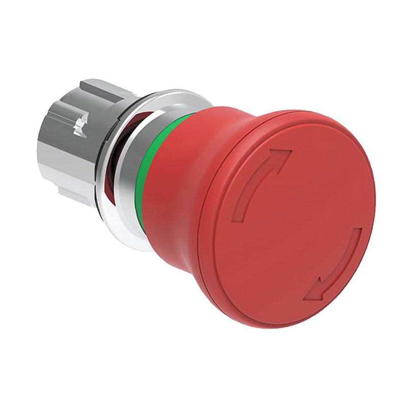 Mushroom button Lovato Platinum diameter 40mm, with hooking, rotating release, Red color, emergency stop application, ISO 13850 compliant.
